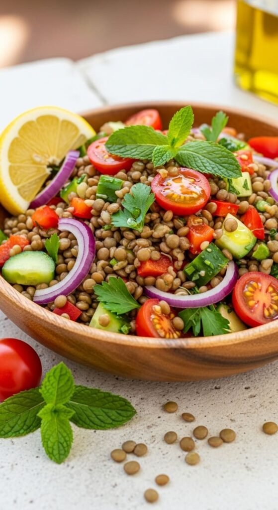 - In a bowl, combine cooked lentils, tomatoes, olives, and cucumber.
