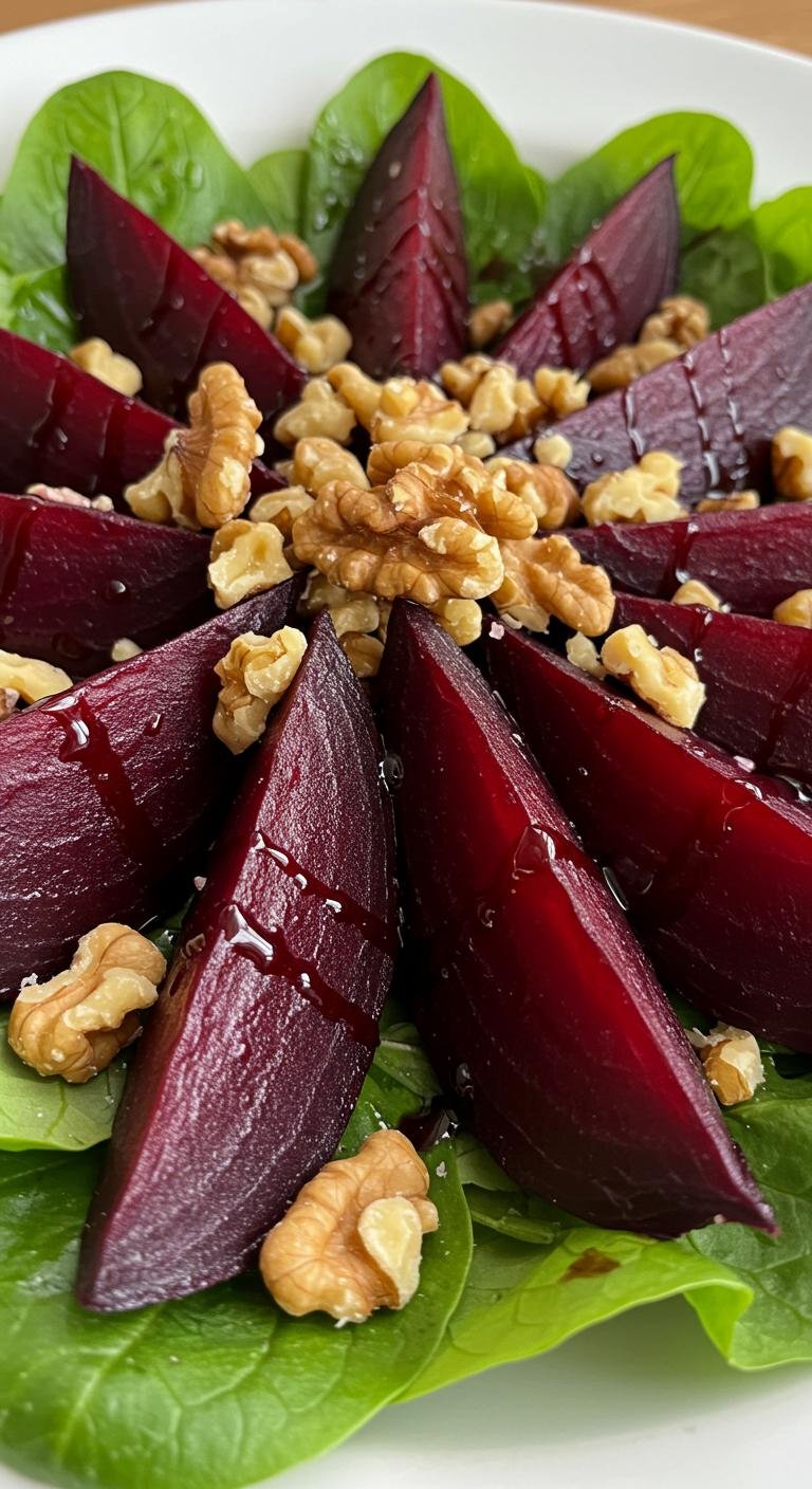 - In a bowl, combine mixed greens, roasted beets, walnuts, and feta.