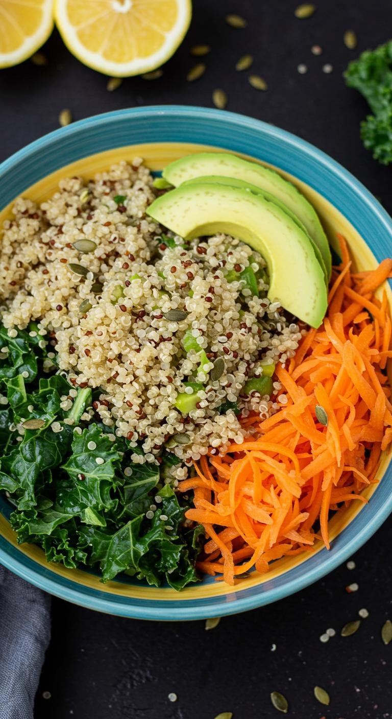 - In a large bowl, mix quinoa, kale, and shredded carrot.