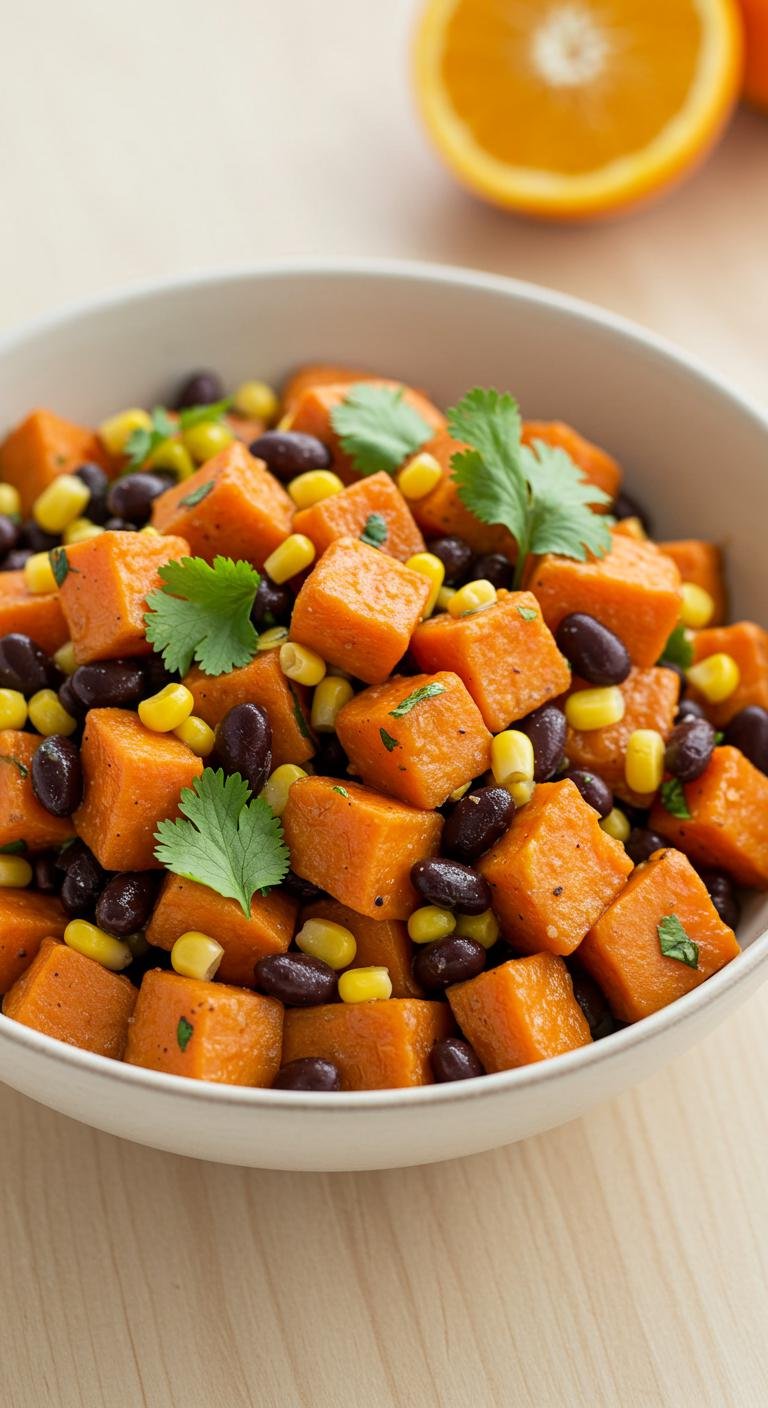 - In a bowl, combine roasted sweet potato, black beans, corn, and cilantro.