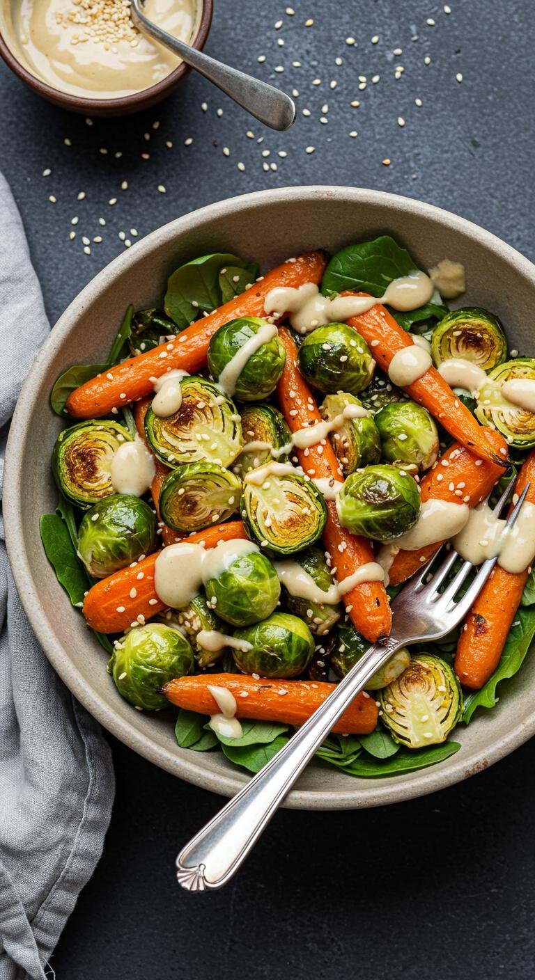 - In a bowl, mix roasted Brussels sprouts, carrots, and cherry tomatoes.