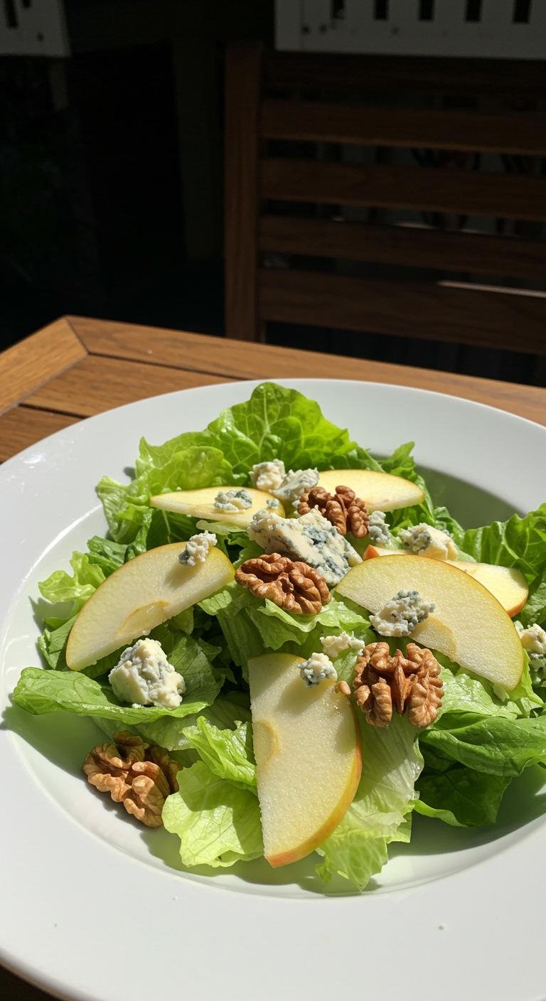 - In a bowl, layer mixed greens, apple slices, gorgonzola, and walnuts.