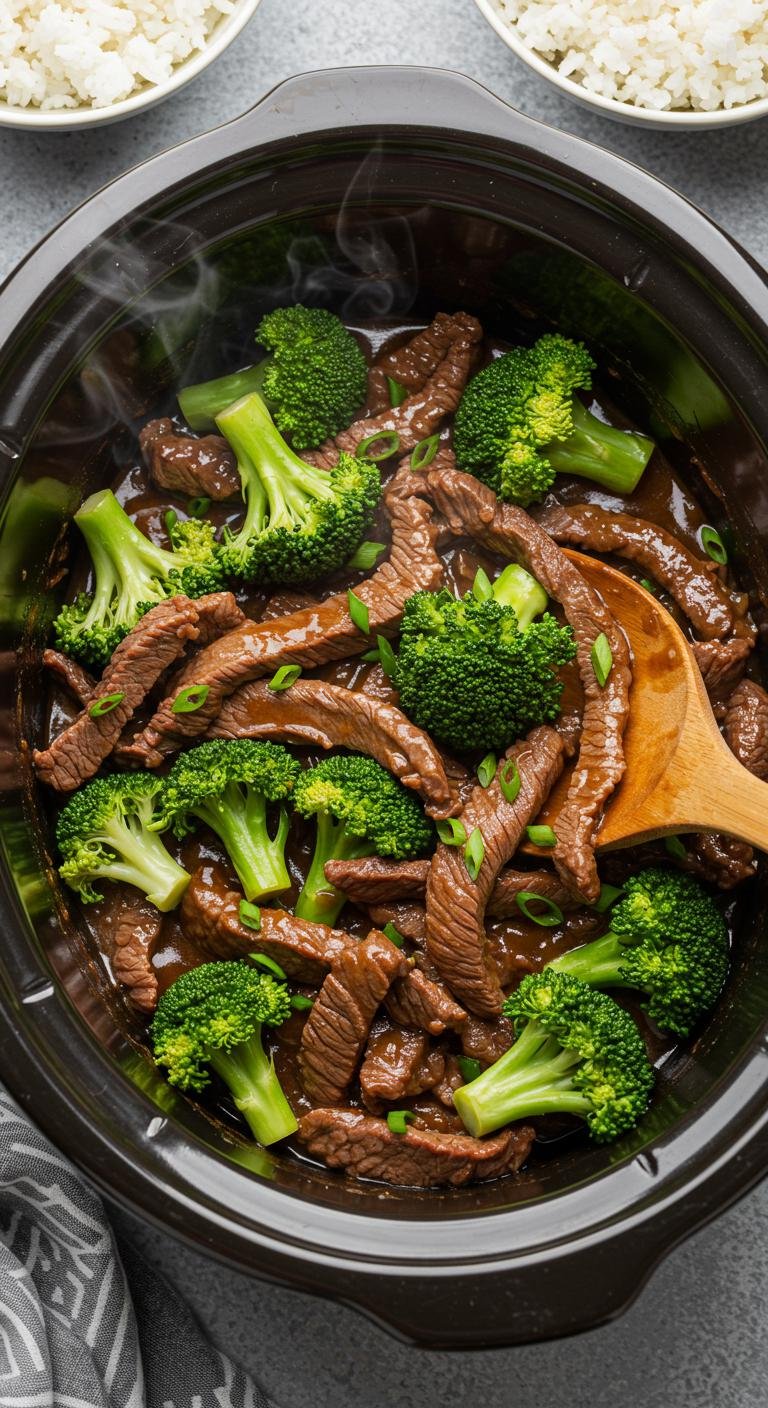 - Combine beef, broth, soy sauce, and ginger in the slow cooker.