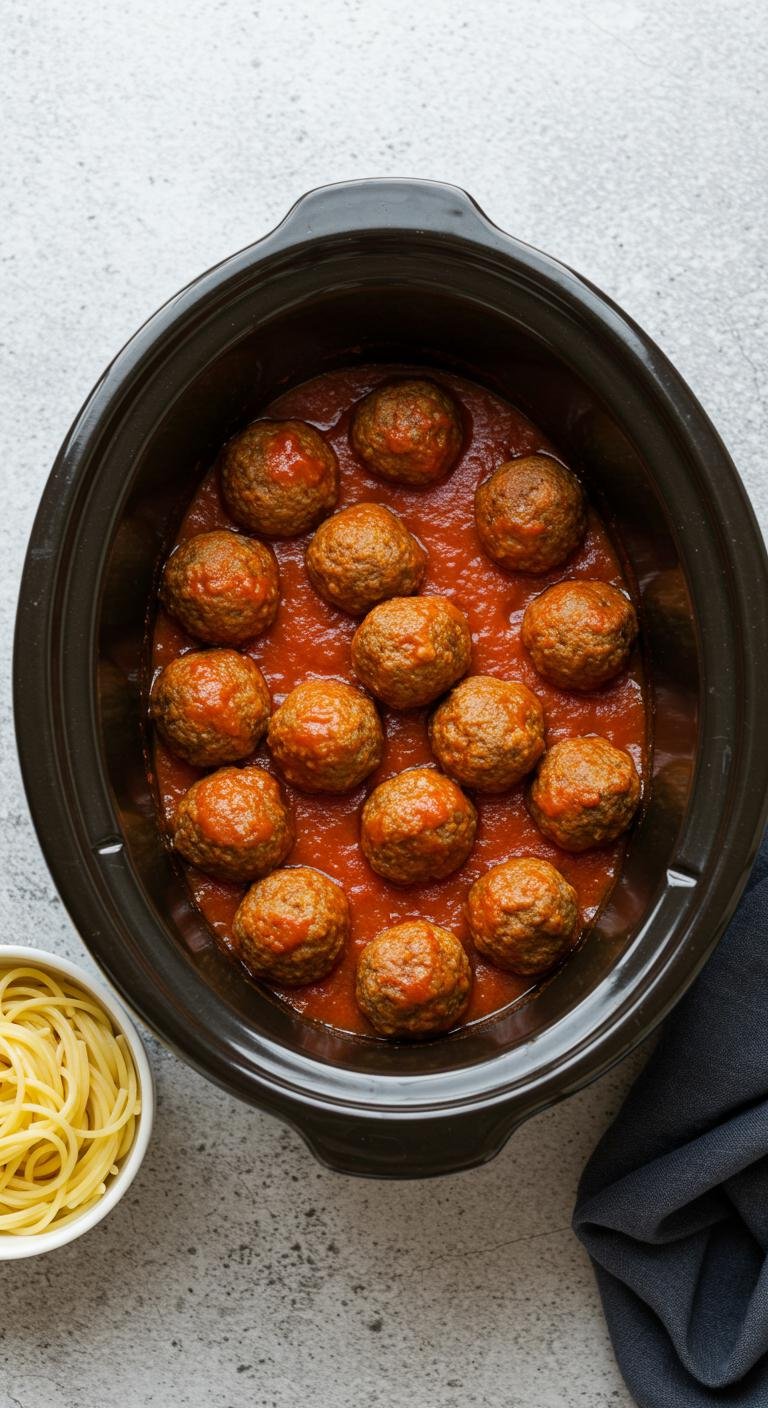 - Place meatballs in a slow cooker and cover with marinara sauce.